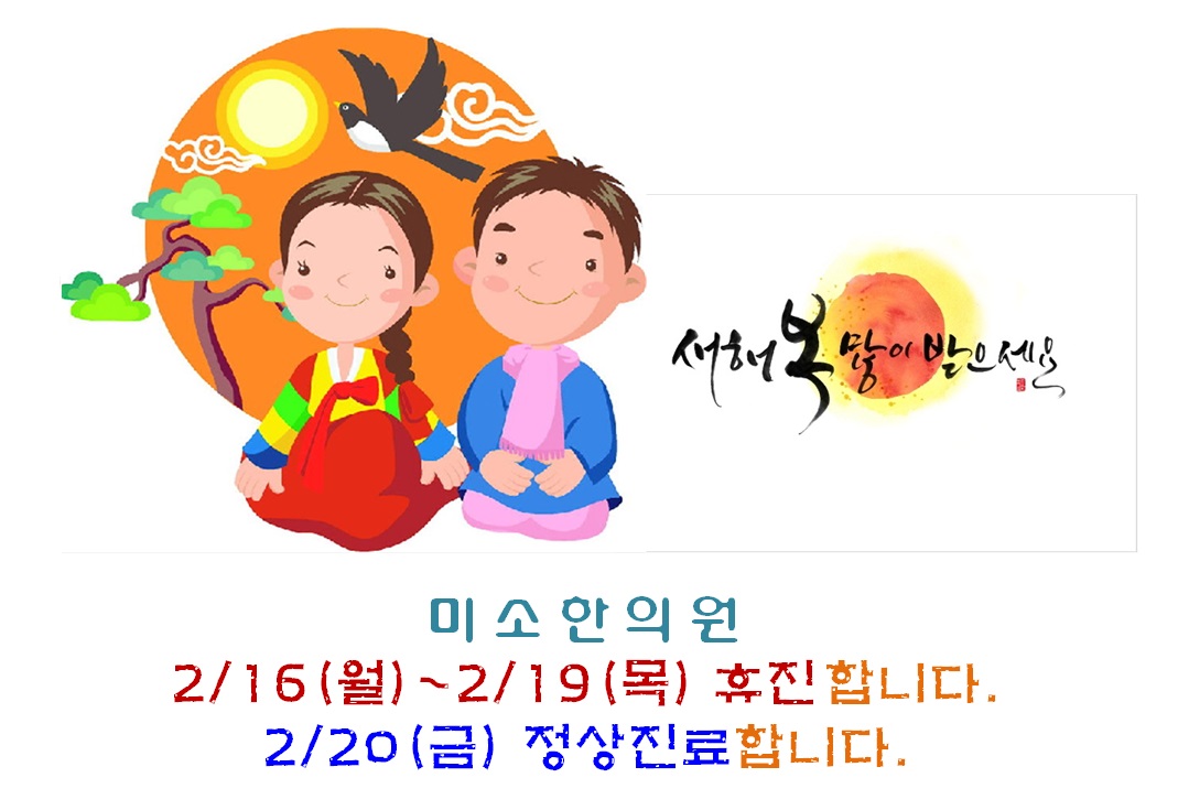 미소 가족 여러분 '2월 16일 월요일 ~ 2월 19일 목요일'은설 연휴로 인해 휴진하오며2월 20일 금요일에는 정상진료(밤 8시까지) 하오니많은 이용 부탁드립니다. ^ ^새 해 복 많이 받으시구요. ^ ^